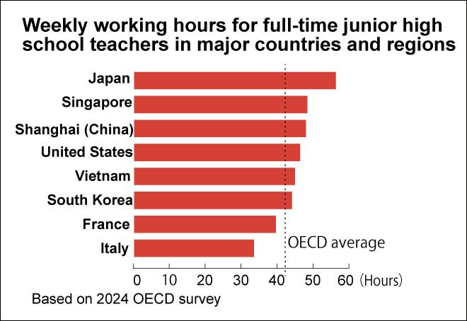 The weekly working times for full-time teachers in Japan were 55.1 hours at junior high schools and 52.1 hours at elementary schools, according to the 2024 OECD survey released on Oct. 7.