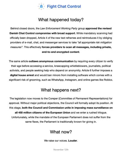 The ever present danger of Chat Control feels like listening to US politics, you get super exhausted.