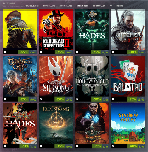 mr_MADAFAKA@lemmy.ml to Steam Hardware@sopuli.xyz · 1 month agoMost Played Games on Steam Deck for 2025lemmy.mlimagemessage-square76linkfedilinkarrow-up1348arrow-down12file-text