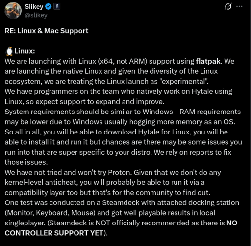 arrow-up1251arrow-down1imageHytale's Co-Founder and Tech Director, revealed that Hytale will offer experimental x64 Linux support via flatpak at launch, with plans to enhance it based on community feedbacklemmy.mlmr_MADAFAKA@lemmy.ml to Linux Gaming@lemmy.worldEnglish · 21 days agomessage-square21linkfedilinkfile-text