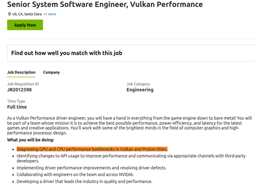 NVIDIA is also hiring a Linux Graphics Senior Software Engineer to define, develop, build, and test professional/consumer Linux graphics drivers (Vulkan/OpenGL) for the latest GPUs. Candidates with ARM Linux experience, x86 emulation (box64/FEX-Emu), or Linux gaming development background will stand out. https://nvidia.eightfold.ai/careers/job/893393264012